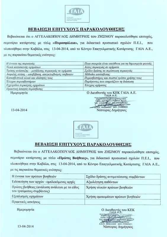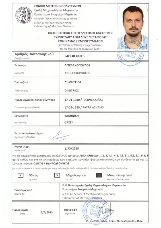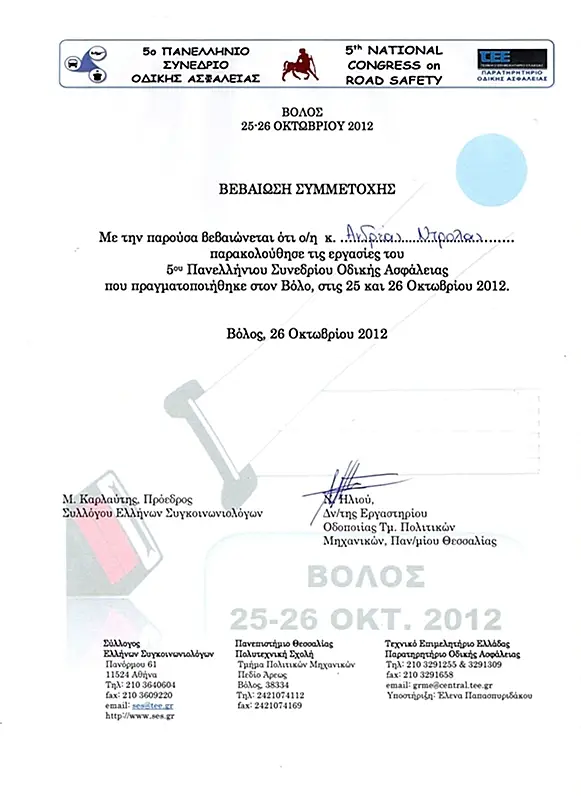 Με συμμετοχές σε συνέδρια και σεμινάρια για την ΟΔΙΚΗ ΑΣΦΑΛΕΙΑ και την εκπαίδευση και επαγγελματική εμπειρία στην οδήγηση βαρέων οχημάτων.