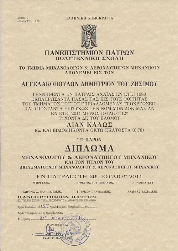 Διπλωματούχος Μηχανολόγος Μηχανικός του Πανεπιστημίου Πατρών με διπλωματική εργασία στην ΟΔΙΚΗ ΑΣΦΑΛΕΙΑ και συνεχή επιμόρφωση.